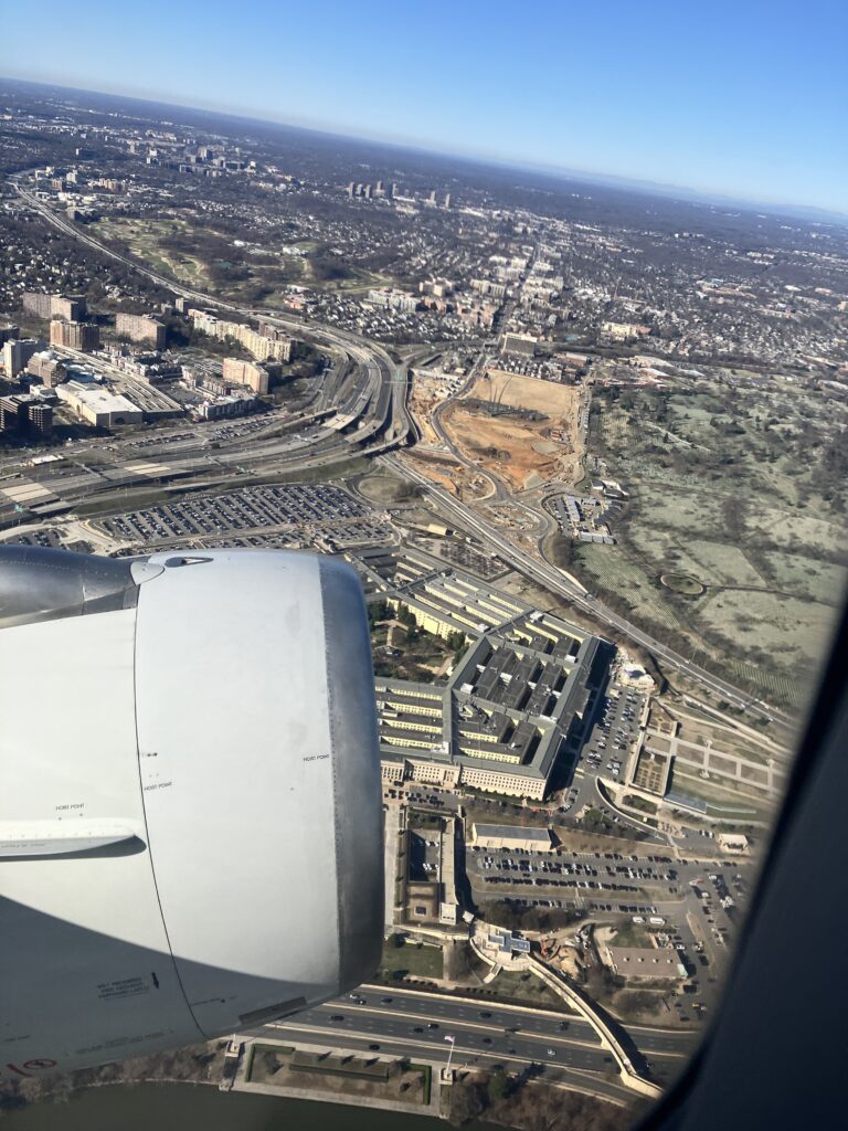 DCAは離陸後に川沿いを通るルートになることもあり、眺めが当たると当たりです(ただし滑走路・風向き・管制で変わります)。「景色優先なら窓側を取る」くらいの期待値がちょうどいいです。ホワイトハウスやペンタゴンなどの景色が上空から見ることできます。